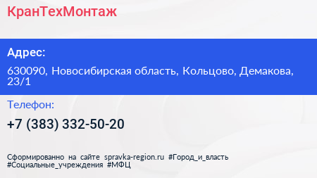КранТехМонтаж по адресу 630090, Новосибирская область, Кольцово, Демакова, 23/1 в дальнейшем Организация, размещена в следующих категориях: