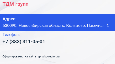 ТДМ групп по адресу 630090, Новосибирская область, Кольцово, Пасечная, 1 в дальнейшем Организация, размещена в следующих категориях: