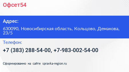 Офсет54 по адресу 630090, Новосибирская область, Кольцово, Демакова, 23/5 в дальнейшем Организация, размещена в следующих категориях:
