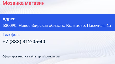 Мозаика, магазин по адресу 630090, Новосибирская область, Кольцово, Пасечная, 1а в дальнейшем Организация, размещена в следующих категориях: