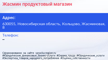 Жасмин, продуктовый магазин по адресу 630055, Новосибирская область, Кольцово, Жасминовая, 8 в дальнейшем Организация, размещена в следующих категориях: