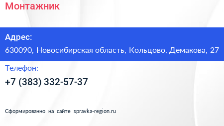 Монтажник по адресу 630090, Новосибирская область, Кольцово, Демакова, 27 в дальнейшем Организация, размещена в следующих категориях: