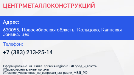 ЦЕНТРМЕТАЛЛОКОНСТРУКЦИЙ по адресу 630055, Новосибирская область, Кольцово, Каинская Заимка, цех в дальнейшем Организация, размещена в следующих категориях: