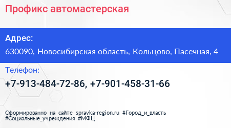 Профикс, автомастерская по адресу 630090, Новосибирская область, Кольцово, Пасечная, 4 в дальнейшем Организация, размещена в следующих категориях: