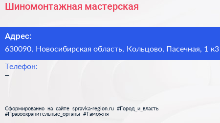 Шиномонтажная мастерская по адресу 630090, Новосибирская область, Кольцово, Пасечная, 1 к3 в дальнейшем Организация, размещена в следующих категориях:
