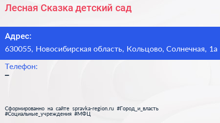 Лесная Сказка, детский сад по адресу 630055, Новосибирская область, Кольцово, Солнечная, 1а в дальнейшем Организация, размещена в следующих категориях: