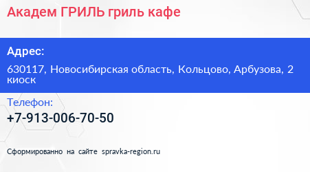 Академ ГРИЛЬ, гриль-кафе по адресу 630117, Новосибирская область, Кольцово, Арбузова, 2 киоск в дальнейшем Организация, размещена в следующих категориях: