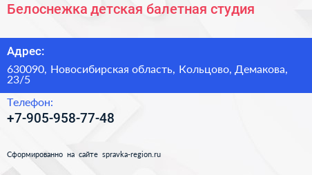 Белоснежка, детская балетная студия по адресу 630090, Новосибирская область, Кольцово, Демакова, 23/5 в дальнейшем Организация, размещена в следующих категориях: