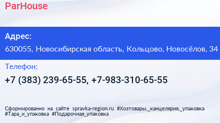 ParHouse по адресу 630055, Новосибирская область, Кольцово, Новосёлов, 34 в дальнейшем Организация, размещена в следующих категориях: