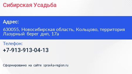 Сибирская Усадьба по адресу 630055, Новосибирская область, Кольцово, территория Лазурный берег днп, 17а в дальнейшем Организация, размещена в следующих категориях: