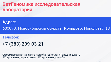 ВетГеномика, исследовательская лаборатория по адресу 630090, Новосибирская область, Кольцово, Николаева, 13 в дальнейшем Организация, размещена в следующих категориях: