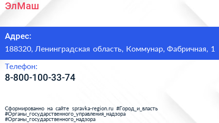 ЭлМаш по адресу 188320, Ленинградская область, Коммунар, Фабричная, 1 в дальнейшем Организация, размещена в следующих категориях:
