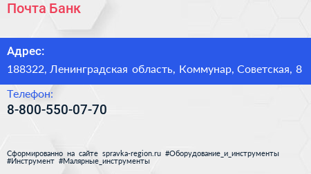 Почта Банк по адресу 188322, Ленинградская область, Коммунар, Советская, 8 в дальнейшем Организация, размещена в следующих категориях: