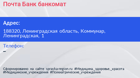 Почта Банк, банкомат по адресу 188320, Ленинградская область, Коммунар, Ленинградская, 1 в дальнейшем Организация, размещена в следующих категориях: