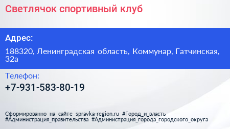 Светлячок, спортивный клуб по адресу 188320, Ленинградская область, Коммунар, Гатчинская, 32а в дальнейшем Организация, размещена в следующих категориях: