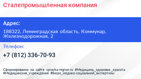 Сталепромышленная компания по адресу 188322, Ленинградская область, Коммунар, Железнодорожная, 2 в дальнейшем Организация, размещена в следующих категориях: