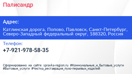 Палисандр по адресу Катлинская дорога, Попово, Павловск, Санкт-Петербург, Северо-Западный федеральный округ, 188320, Россия в дальнейшем Организация, размещена в следующих категориях:
