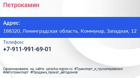 Петрокамин по адресу 188320, Ленинградская область, Коммунар, Западная, 12 в дальнейшем Организация, размещена в следующих категориях: