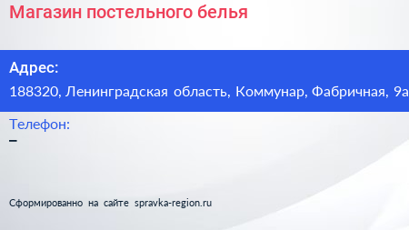 Магазин постельного белья по адресу 188320, Ленинградская область, Коммунар, Фабричная, 9а в дальнейшем Организация, размещена в следующих категориях:
