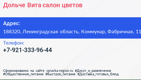 Дольче Вита, салон цветов по адресу 188320, Ленинградская область, Коммунар, Фабричная, 11 в дальнейшем Организация, размещена в следующих категориях: