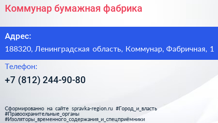 Коммунар, бумажная фабрика по адресу 188320, Ленинградская область, Коммунар, Фабричная, 1 в дальнейшем Организация, размещена в следующих категориях:
