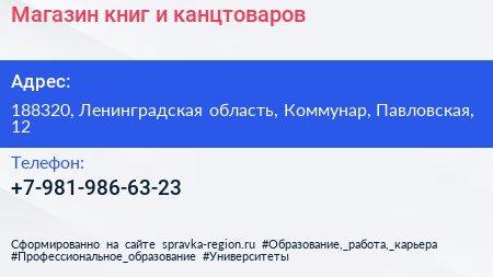 Магазин книг и канцтоваров по адресу 188320, Ленинградская область, Коммунар, Павловская, 12 в дальнейшем Организация, размещена в следующих категориях:
