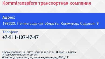 Kommtranssfera, транспортная компания по адресу 188320, Ленинградская область, Коммунар, Садовая, 9 в дальнейшем Организация, размещена в следующих категориях: