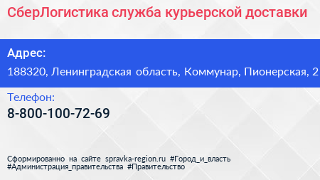СберЛогистика, служба курьерской доставки по адресу 188320, Ленинградская область, Коммунар, Пионерская, 2 в дальнейшем Организация, размещена в следующих категориях: