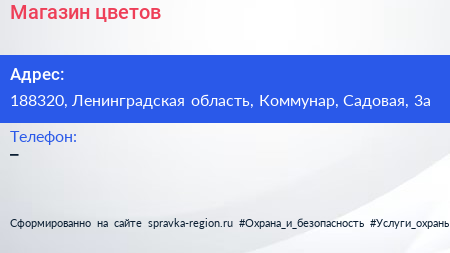 Магазин цветов по адресу 188320, Ленинградская область, Коммунар, Садовая, 3а в дальнейшем Организация, размещена в следующих категориях: