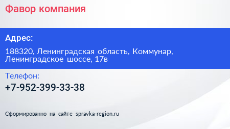 Фавор, компания по адресу 188320, Ленинградская область, Коммунар, Ленинградское шоссе, 17в в дальнейшем Организация, размещена в следующих категориях:
