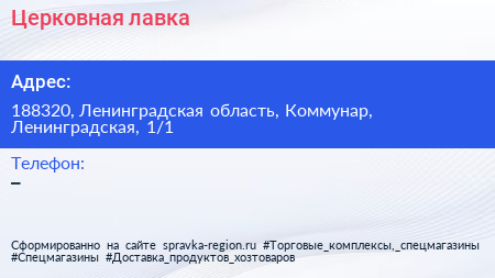 Церковная лавка по адресу 188320, Ленинградская область, Коммунар, Ленинградская, 1/1 в дальнейшем Организация, размещена в следующих категориях: