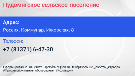 Пудомягское сельское поселение по адресу МФЦ «Мои документы», 8, Ижорская улица, Западное, Лукаши, Гатчинский муниципальный округ, Ленинградская область, Северо-Западный федеральный округ, 188324, Россия в дальнейшем Организация, размещена в следующих категориях: