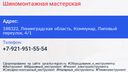 Шиномонтажная мастерская по адресу 188322, Ленинградская область, Коммунар, Липовый переулок, 4/1 в дальнейшем Организация, размещена в следующих категориях: