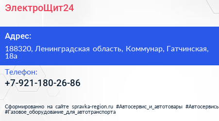 ЭлектроЩит24 по адресу 188320, Ленинградская область, Коммунар, Гатчинская, 18а в дальнейшем Организация, размещена в следующих категориях:
