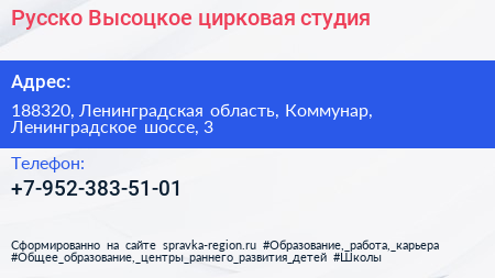 Русско-Высоцкое, цирковая студия по адресу 188320, Ленинградская область, Коммунар, Ленинградское шоссе, 3 в дальнейшем Организация, размещена в следующих категориях: