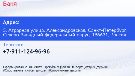 Баня по адресу 5, Аграрная улица, Александровская, Санкт-Петербург, Северо-Западный федеральный округ, 196631, Россия в дальнейшем Организация, размещена в следующих категориях: