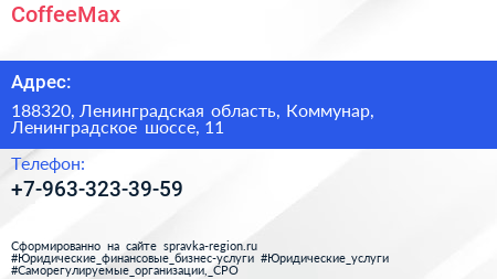 CoffeeMax по адресу 188320, Ленинградская область, Коммунар, Ленинградское шоссе, 11 в дальнейшем Организация, размещена в следующих категориях:
