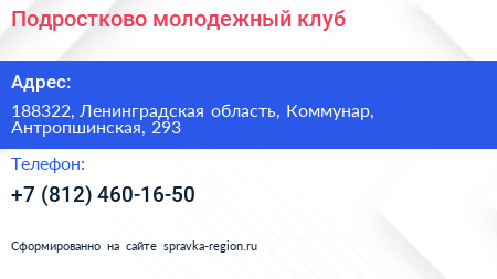 Подростково-молодежный клуб по адресу 188322, Ленинградская область, Коммунар, Антропшинская, 293 в дальнейшем Организация, размещена в следующих категориях: