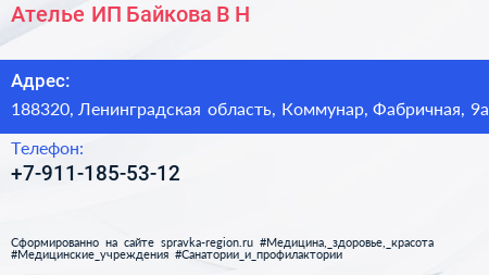 Ателье, ИП Байкова В.Н. по адресу 188320, Ленинградская область, Коммунар, Фабричная, 9а в дальнейшем Организация, размещена в следующих категориях: