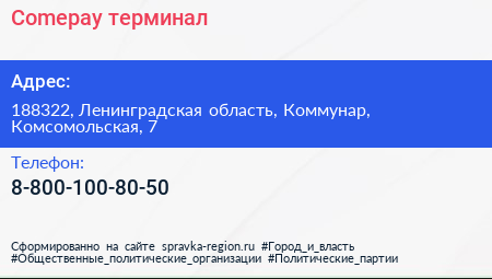 Comepay, терминал по адресу 188322, Ленинградская область, Коммунар, Комсомольская, 7 в дальнейшем Организация, размещена в следующих категориях: