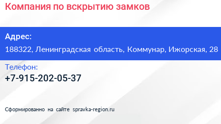 Компания по вскрытию замков по адресу 188322, Ленинградская область, Коммунар, Ижорская, 28 в дальнейшем Организация, размещена в следующих категориях: