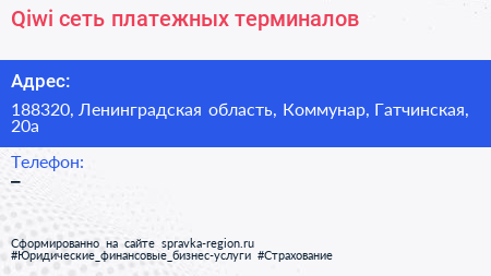 Qiwi, сеть платежных терминалов по адресу 188320, Ленинградская область, Коммунар, Гатчинская, 20а в дальнейшем Организация, размещена в следующих категориях: