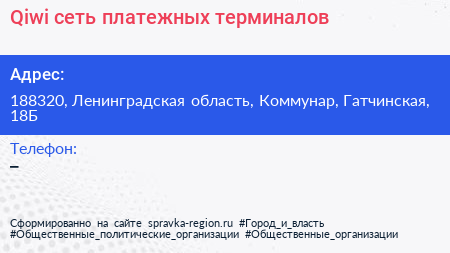 Qiwi, сеть платежных терминалов по адресу 188320, Ленинградская область, Коммунар, Гатчинская, 18Б в дальнейшем Организация, размещена в следующих категориях: