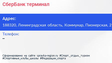 СберБанк, терминал по адресу 188320, Ленинградская область, Коммунар, Пионерская, 2 в дальнейшем Организация, размещена в следующих категориях: