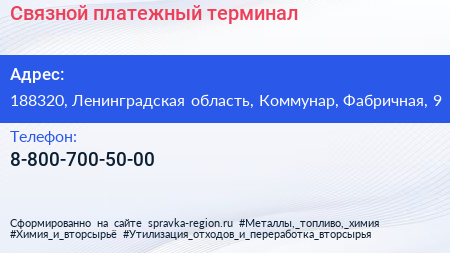 Связной, платежный терминал по адресу 188320, Ленинградская область, Коммунар, Фабричная, 9 в дальнейшем Организация, размещена в следующих категориях:
