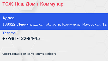 ТСЖ Наш Дом, г. Коммунар по адресу 188322, Ленинградская область, Коммунар, Ижорская, 12 в дальнейшем Организация, размещена в следующих категориях: