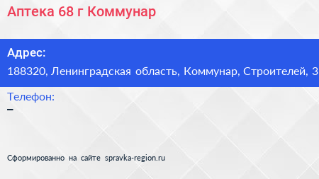 Аптека №68, г. Коммунар по адресу 188320, Ленинградская область, Коммунар, Строителей, 3 в дальнейшем Организация, размещена в следующих категориях: