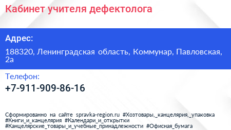 Кабинет учителя-дефектолога по адресу 188320, Ленинградская область, Коммунар, Павловская, 2а в дальнейшем Организация, размещена в следующих категориях: