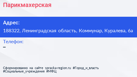 Парикмахерская по адресу 188322, Ленинградская область, Коммунар, Куралева, 6а в дальнейшем Организация, размещена в следующих категориях: