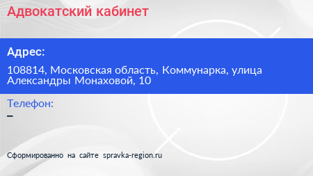 Адвокатский кабинет по адресу 108814, Московская область, Коммунарка, улица Александры Монаховой, 10 в дальнейшем Организация, размещена в следующих категориях: